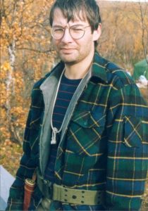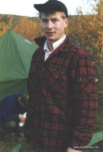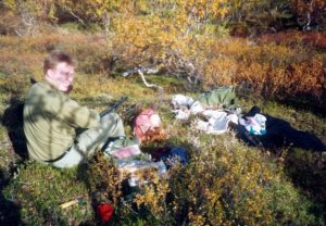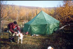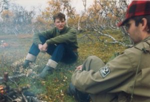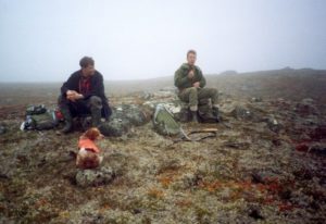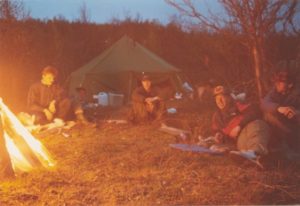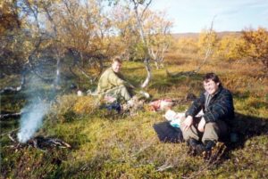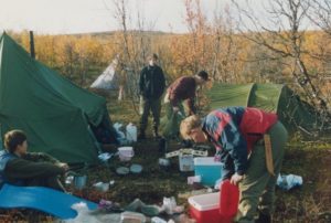 Siste kvelden i Sirma. Erling fikk endelig brukt whiskey-en sin til noe, tennvæske (!). Lars, John Arild (bak Lars), Eirik, Tore og Erling.