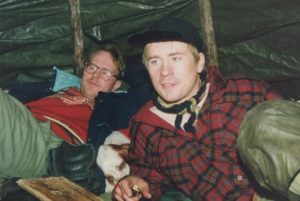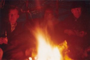 Tore, Eirik og John Arild i "lavvoen". Vi lagde oss lavvo av ei pressening og noen stranger vi fant ute i marka.