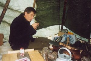 Havregryn med melk og sukker er god knall. Hans inntar frokost i lavvoen.