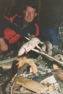 Tore er klar til "middag". Vi fikk fisk i vannet ved leirplassen, og den stekte vi på bålet i "lavvoen".