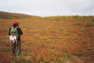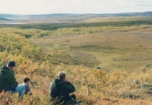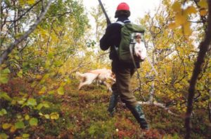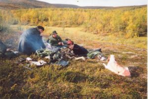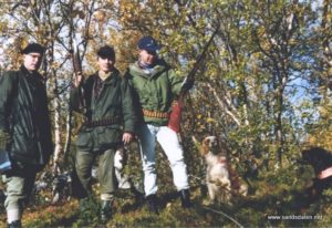 Skogen foran oss heter Njuorganvuombi, som på norsk skal være noe sånn som Plystreskogen (sikkert etter fortvilte jegere med hund de jakter med men ikke kan se). Tore, John Arild og Eirik