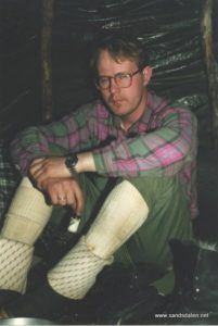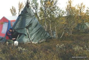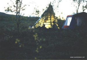 Tore hadde med ei presenning. Den ble brukt til lavvo. Tore på vei inn.